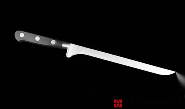 别名叫“金汤力”刀,这种刀可以避免其他的刀具受到严重的磨损。刀上的锯齿可以很轻松地切开坚硬的皮,也能安全地切开圆形的食材,不使它滚动。比如粗大的香肠和番茄、柠檬等蔬果。