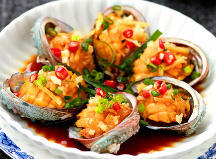 5、另起锅烧热油,加入剩余的蒜末和小红辣椒粒爆香,趁热浇在鲍鱼上即可。