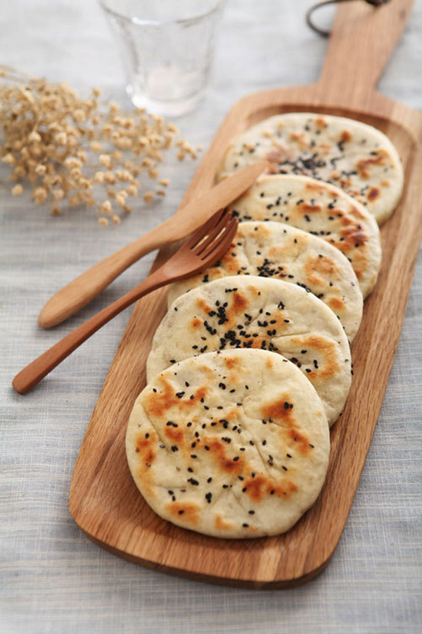 4、包子口朝下,用擀面棍擀一擀成片状,沿边卷起,撒少许面粉,再擀一次后用手掌压扁,撒上少许黑芝麻。