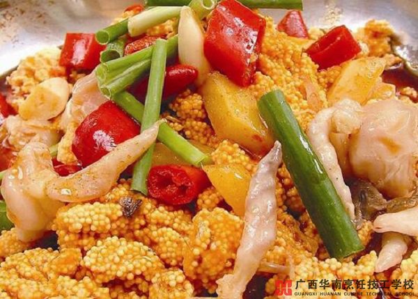 4、炒锅放油烧热,姜片、葱丝、蒜片炝锅,下辣椒和微好的鱼籽翻炒,加入鱼鳔翻炒,加生抽适量,少量糖,高汤浸过鱼籽。