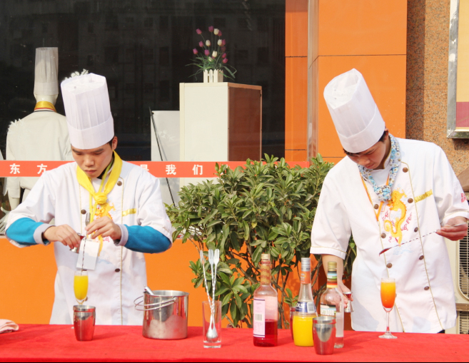 同学们台上挥舞着身姿,他们的动作娴熟,一只普普通通的酒瓶在他们手中变成了乐曲指挥棒,浮尘着,波荡着,有力的演奏着。音乐中,学生们同时调酒,只见他们拿着几种酒,确定好配料比例,开始注入调酒杯,有的原料需要轻缓注入调酒杯,有的需要用力摇晃,不同的材料在手中原来功效不同。