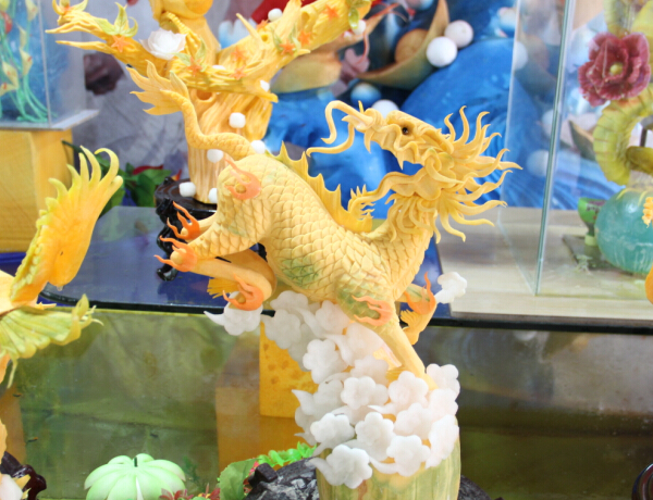 广西华南烹饪学校校园里有一个展台,每天都会吸引大量市民前去围观,有的还拿出相机进行拍摄,走进一看,原来是广西华南烹饪学校学生雕刻作品展。展台上有用南瓜雕成的雄鹰、孔雀、喜鹊、鲤鱼,萝卜雕成的百花、玫瑰,个个栩栩如生,乍一眼还以为是活物。这些雕刻更有好听的名字,这个老鹰翱翔的作品叫作雄鹰展翅,那个菊花百合争相开放的作品叫百花齐放,这个叫福星高照,那个叫寿比南山,真是一听名字就有诗情画意。