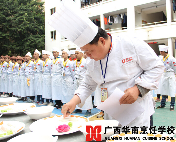 近日,广西华南烹饪学校的操场上,一条近五十米的“美食长廊”吸引了众多学子围观,成为校园里的一道风景线。走进一看,原来是同学们热菜、凉菜、刀工、雕刻阶段考核的作品展。