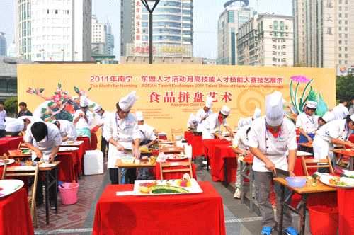 10月23日上午,南宁东盟人才活动月启动仪式在金湖广场举行,活动月人才技能大赛也在本次的启动仪式上同时展开。来自泰国、柬埔寨等国领导、自治区、南宁市、和各部门等相关领导以及南宁市优秀人才代表等约600人出席