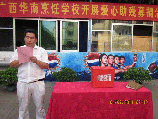 2011年7月23日上午,广西华南烹饪学校隆重举办首届技能演示会。这是我校举办的首届大型技能演示会,我校领导高度重视此次活动,王成校长、教务科魏兆权老师、学生科司胜东老师、后勤保障部万家国老师等出席了此次活