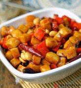 材料:年糕、胡萝卜、花生米、葱花、辣椒、花椒、生抽、醋、料酒、糖、盐、鸡精、水淀粉 做法:1、年糕、胡萝卜切丁,花生米炸一次; 2、1大勺生抽、1大勺半醋、1大勺料酒、1大勺半糖、盐、鸡精、水淀粉、葱花兑成碗